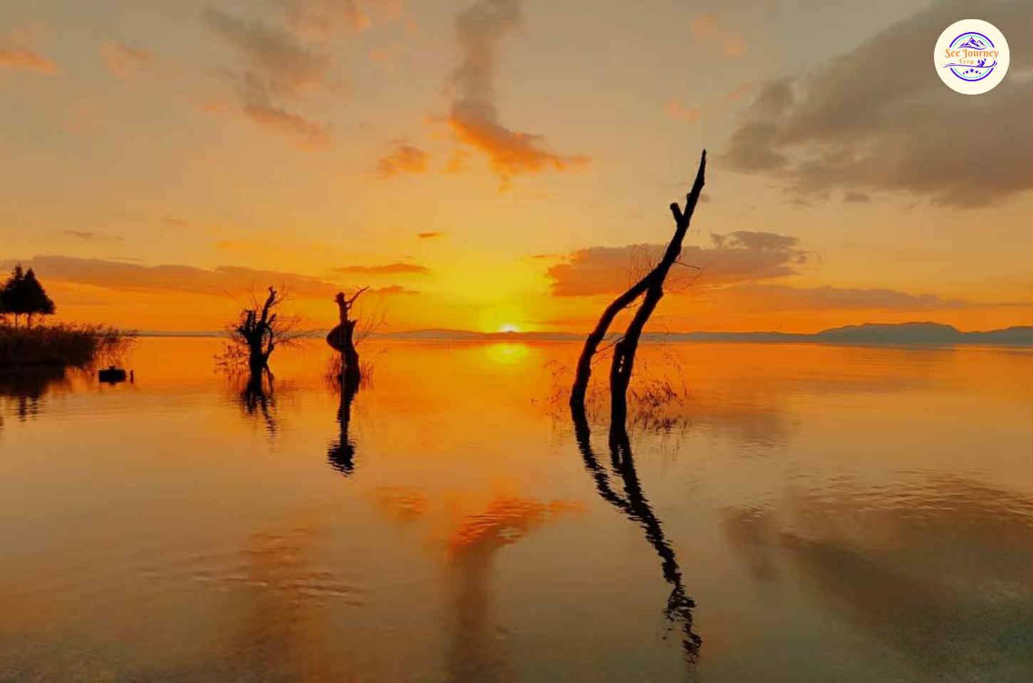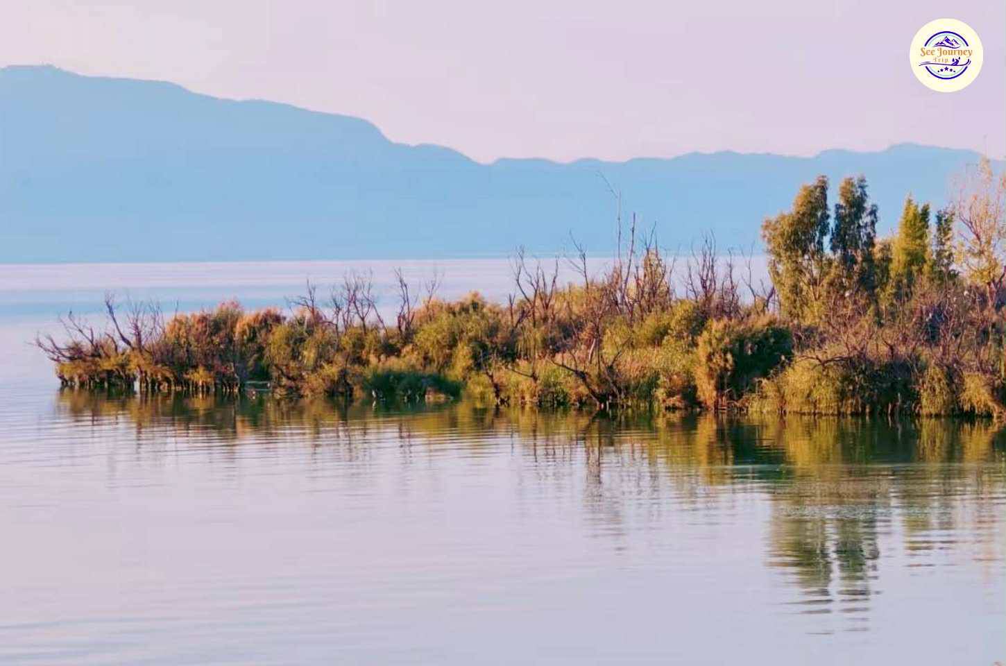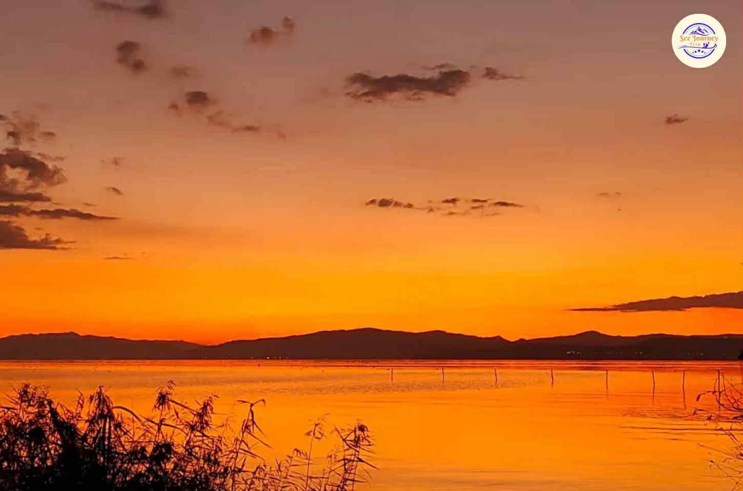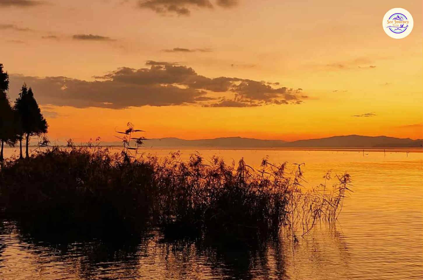 - ทิวทัศน์ทะเลสาบตี้อันฉือ เห็นทะเลสาบกว้างใหญ่ไกลสุดลูกตา โดยมีชุมน้ำเป็นเบื้องหน้า