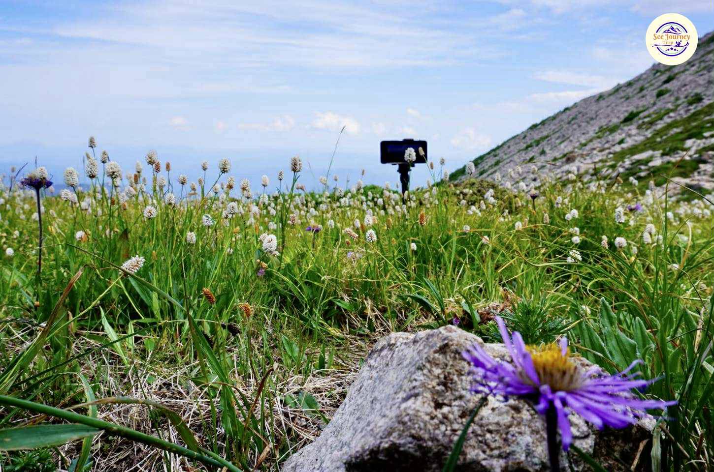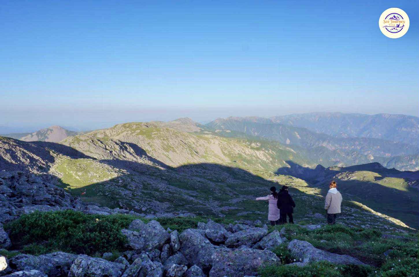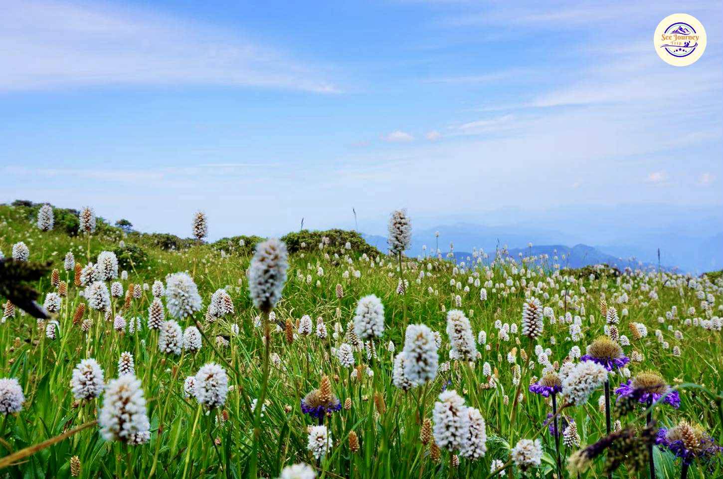 6. ทุ่งหญ้าสีทอง (高山草甸) ในฤดูร้อน ทุ่งหญ้าบนภูเขาจะเปลี่ยนเป็นพรมสีทองสว่างไสว ดอกไม้ป่าหลากสีบานสะพรั่งตัดกับท้องฟ้าและหิมะ